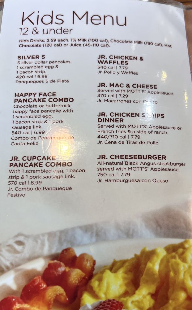 Choice of chocolate or buttermilk pancake filled with chocolate chips. Topped with whipped topping, a chocolate chip smile & fresh strawberry eyes.